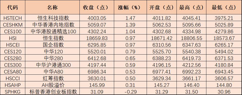 7月11日,港股市場指數(shù)普遍走強,截至收盤,恒生指數(shù)漲0.97%,報18659.83點;恒生科技指數(shù)漲1.47%,報4003.05點,兩大指數(shù)均為連續(xù)第2個交易日實現(xiàn)上漲。