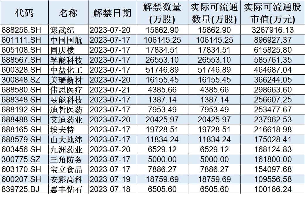 與此同時(shí),據(jù)東方財(cái)富統(tǒng)計(jì)顯示,下周(7月17日-21日)共有109家公司限售股陸續(xù)解禁,按最新收盤價(jià)計(jì)算,解禁市值為931.77億元。從解禁市值來看,寒武紀(jì)-U(326.79億元)、中國國航(89.69億元)、同慶樓(61.58億元)等公司解禁金額均超60億元。