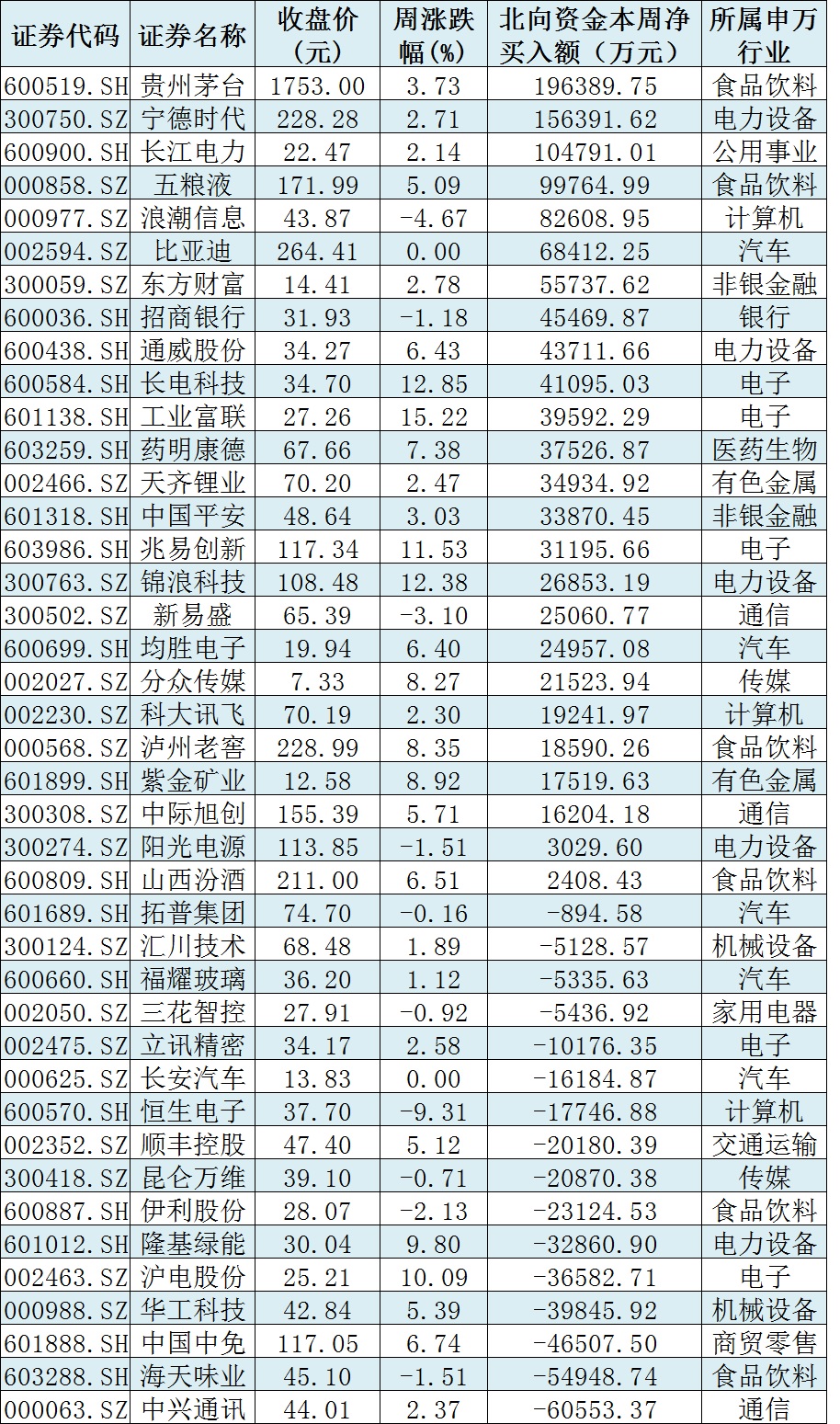資金方面,本周北向資金累計(jì)凈買入金額達(dá)198.44億元,創(chuàng)5個(gè)月來最大單周凈買入,也是年內(nèi)第5大周凈買入。從前十大成交活躍股來看,本周,貴州茅臺(tái)、寧德時(shí)代、長江電力等3只個(gè)股,北向資金凈買入金額均超10億元。另外,中興通訊、海天味業(yè)等個(gè)股遭北向資金凈賣出金額均超5億元。