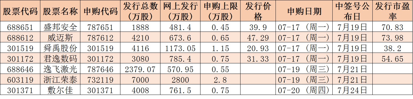 根據(jù)發(fā)行安排,下周(7月17日-21日)有7只新股發(fā)行。具體看,下周一(7月17日)共有4只新股申購,分別為威邁斯、盛邦安全、君逸數(shù)碼、舜禹股份;下周三(7月19日)共有2只新股申購,分別為浙江榮泰、逸飛激光;下周四(7月20日)有1只新股申購,為敷爾佳。