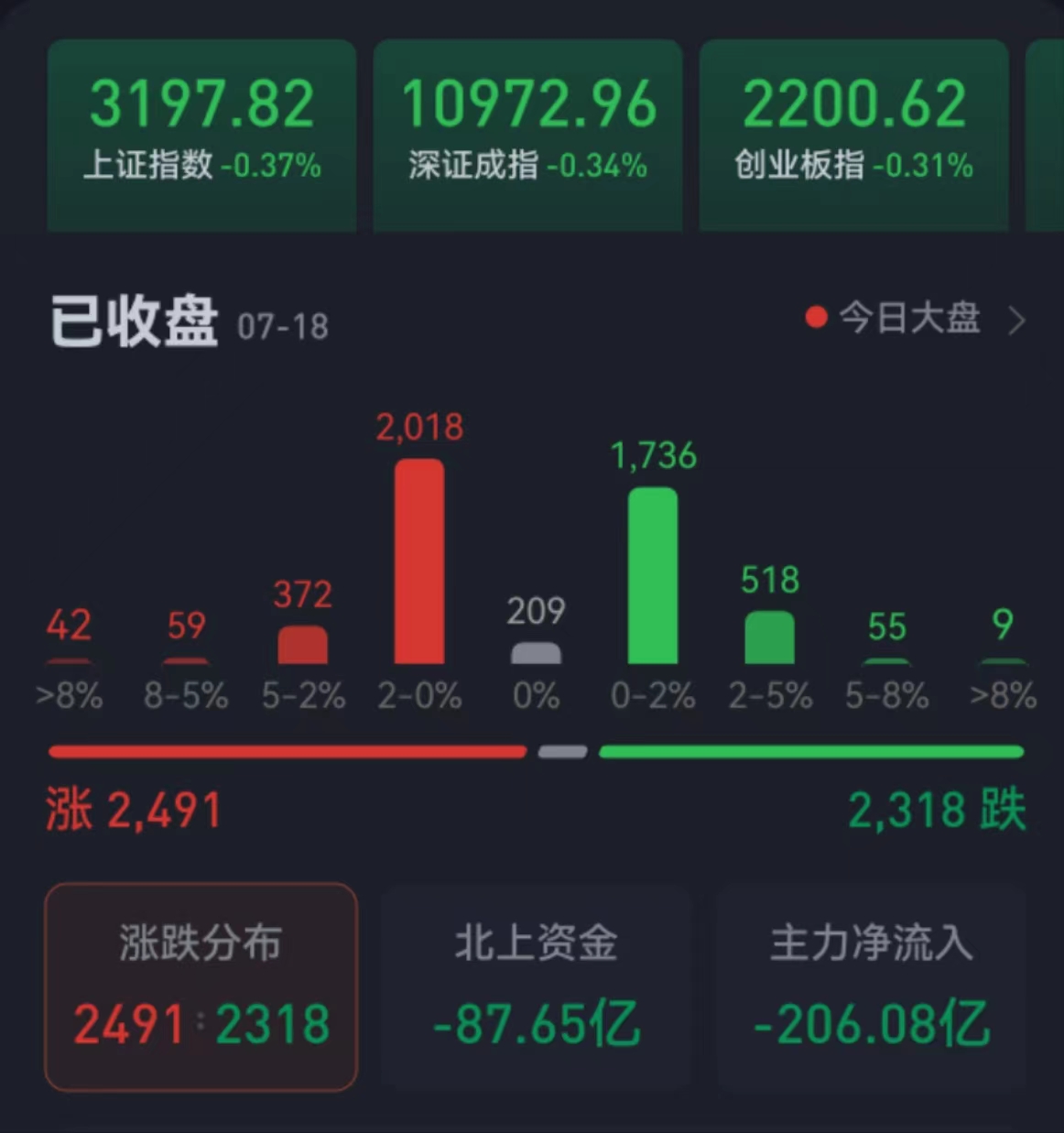 周二(7月18日),A股三大股指震蕩整理,略有下跌。截至收盤(pán),上證指數(shù)跌0.37%報(bào)3197.82點(diǎn),深證成指跌0.34%報(bào)10972.96點(diǎn),創(chuàng)業(yè)板指跌0.31%報(bào)2200.62點(diǎn);兩市合計(jì)成交金額達(dá)7771.3億元,北向資金凈賣(mài)出87.65億元。