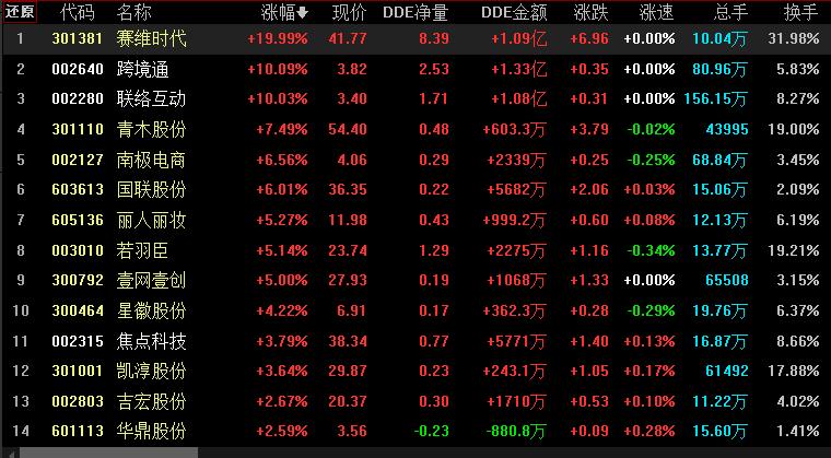 具體看,同花順統(tǒng)計顯示,截至7月20日上午收盤,互聯網電商板塊漲幅居首,達4.96%,資金凈流入達23.25億元。其中,賽維時代20CM漲停,跨境通和聯絡互動等概念股漲幅均超10%。