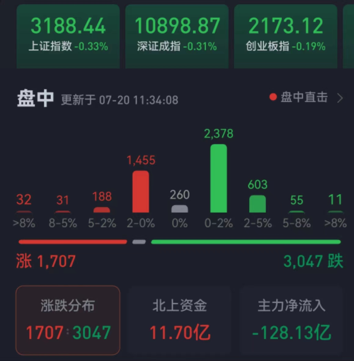 周四(7月20日),三大股指繼續(xù)震蕩整理。截至上午收盤,上證指數跌0.33%,報3188.44點;深證成指和創(chuàng)業(yè)板指跌幅分別為0.31%和0.19%;滬深兩市合計成交額4553.7億元,總體來看,兩市個股跌多漲少。