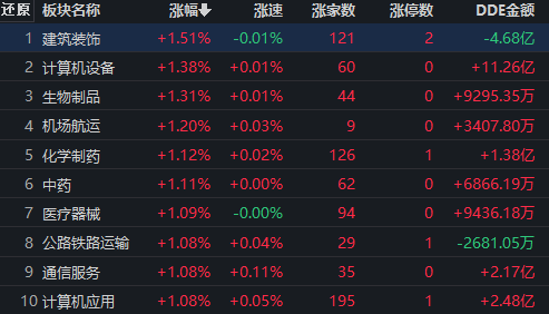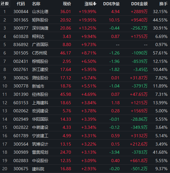 從早盤表現(xiàn)強(qiáng)勢的建筑裝飾行業(yè)看,交易中的154只成份股中,有121只上漲,其中,有10只個(gè)股漲幅超5%。