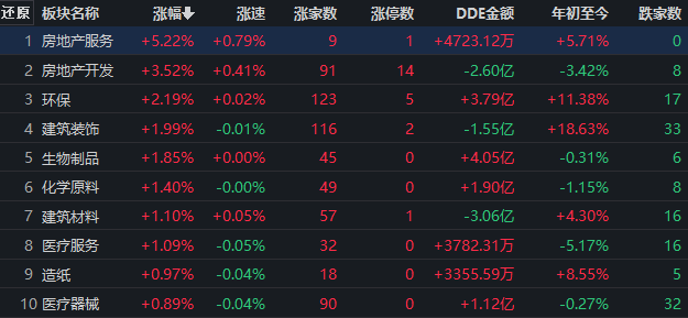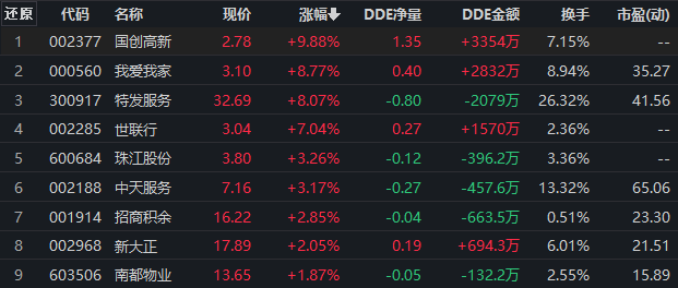 從早盤表現(xiàn)強勢的房地產(chǎn)服務行業(yè)看,交易中的9只成份股全線上漲,其中,有4只個股漲幅超5%。