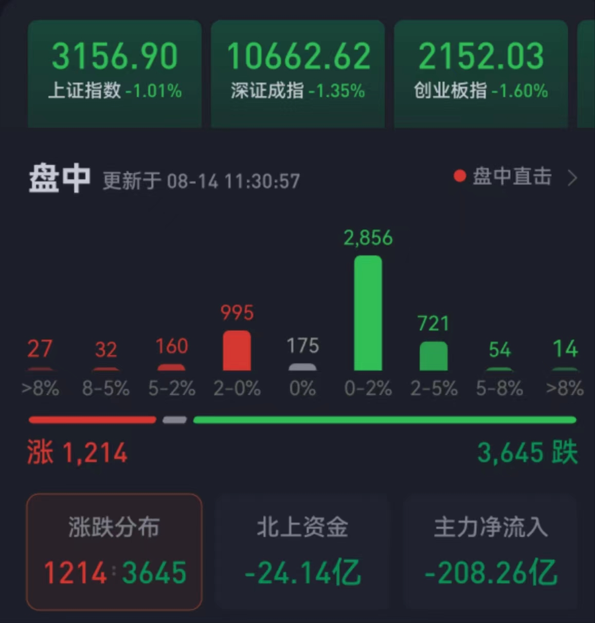 周一(8月14日),三大股指繼續(xù)震蕩回落,跌幅均超1%。截至上午收盤,上證指數(shù)跌幅達1.01%,報3156.90點;深證成指和創(chuàng)業(yè)板指跌幅分別為1.35%和1.60%;滬深兩市合計成交額4603.5億元,總體來看,兩市個股跌多漲少,超3600只個股下跌。