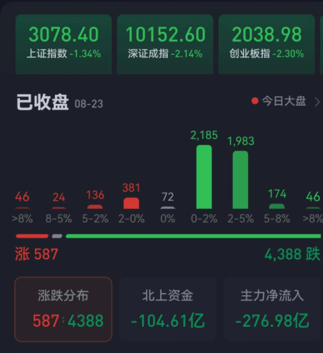 周三(8月23日),A股三大股指震蕩下行,跌幅均超1%。截至收盤,上證指數(shù)跌1.34%報3078.4點,深證成指跌2.14%報10152.6點,創(chuàng)業(yè)板指跌2.3%報2038.98點;兩市合計成交7059.16億元,北向資金凈賣出104.61億元,連續(xù)13日凈賣出??傮w上看,A股個股跌多漲少,下跌個股近4400只。其中,漲停個股達(dá)36只,跌停個股達(dá)19只。