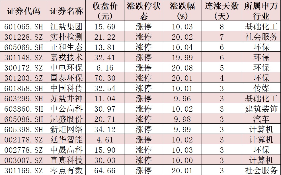 表:連續(xù)上漲3日且今日收盤漲停個股情況: