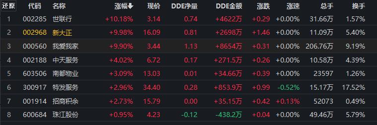 具體看,截至9月4日上午收盤,房地產(chǎn)服務(wù)板塊漲幅居首,達(dá)5.48%。其中,世聯(lián)行、新大正、我愛我家等概念股聯(lián)袂漲停。