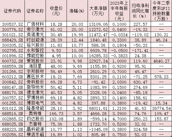 值得關(guān)注的是,以QFII(合格境外機(jī)構(gòu)投資者)為代表的外資也提前布局部分BC電池概念股。數(shù)據(jù)顯示,截至今年二季度末,有8家BC電池概念板塊上市公司的前十大流通股股東中出現(xiàn)QFII身影,以今年6月末收盤價(jià)計(jì)算,持股市值為125.85億元。具體來看,鈞達(dá)股份、英諾激光、奧特維、時(shí)創(chuàng)能源、博菲電氣等5家公司今年二季度獲QFII新進(jìn)持有;愛旭股份獲QFII繼續(xù)加倉,增持?jǐn)?shù)量達(dá)1385.65萬股;今年二季度QFII對(duì)隆基綠能、賽伍技術(shù)的持倉未變,持股數(shù)量分別為36774.54萬股、578.23萬股。