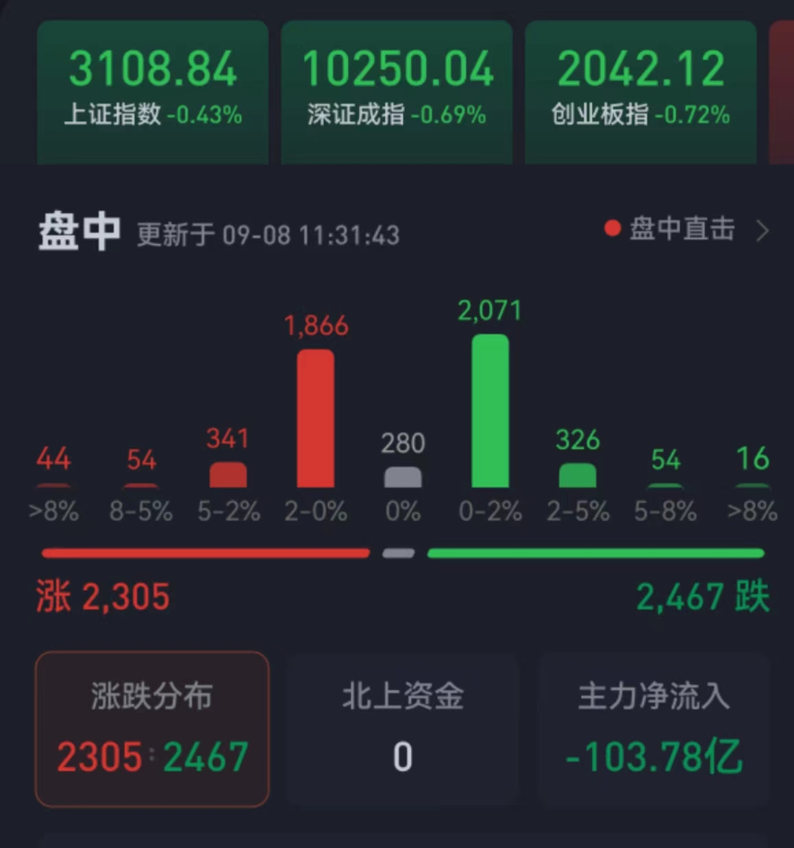 周五(9月8日),三大股指繼續(xù)震蕩回落。截至上午收盤,上證指數(shù)跌幅達(dá)0.43%,報(bào)3108.84點(diǎn);深證成指和創(chuàng)業(yè)板指跌幅分別為0.69%和0.72%;滬深兩市合計(jì)成交額4050.6億元,總體來看,兩市個(gè)股跌多漲少。
