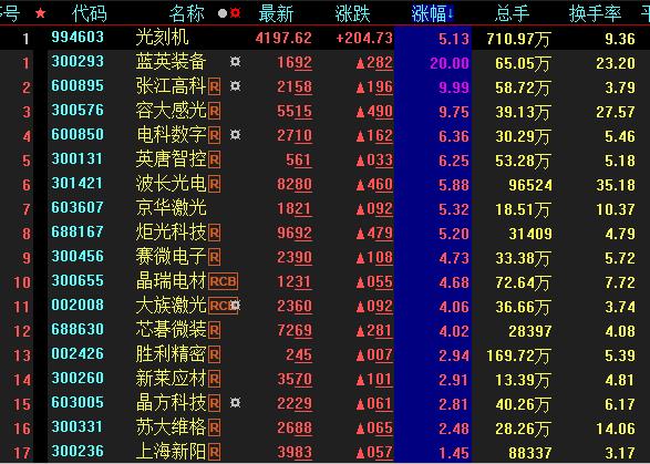 具體看,截至9月8日上午收盤,光刻機(jī)板塊異軍突起,漲幅居首達(dá)5.13%。其中,藍(lán)英裝備20CM漲停,張江高科漲停。