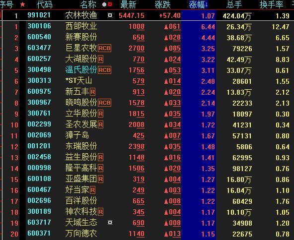 具體看,截至9月20日上午收盤,農(nóng)林牧漁板塊漲幅居首,達1.07%。其中,西部牧業(yè)、新賽股份等概念股漲幅均超4%。