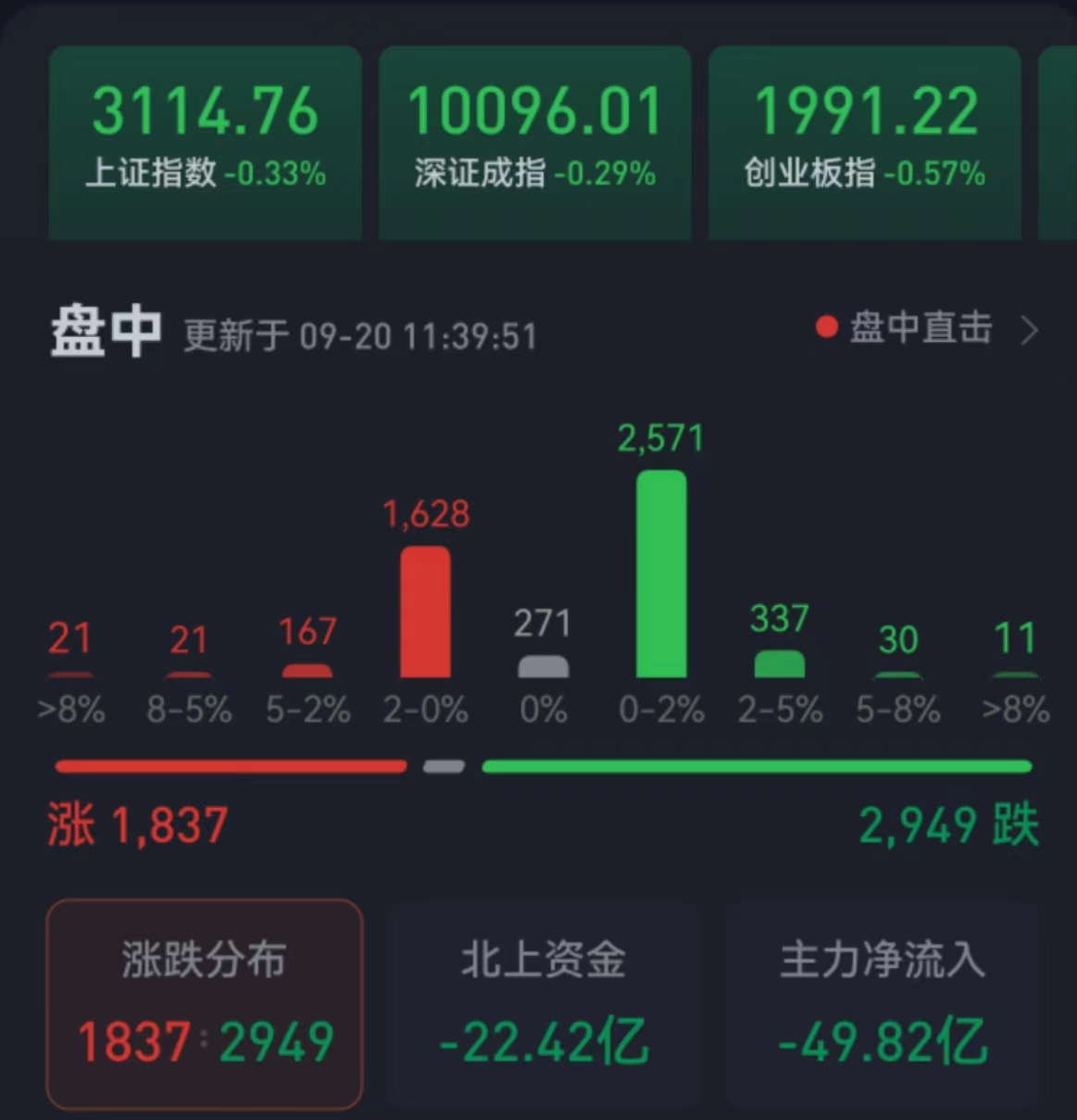 周三(9月20日),三大股指繼續(xù)震蕩整理。截至上午收盤,上證指數(shù)跌幅達0.33%,報3114.76點;深證成指和創(chuàng)業(yè)板指跌幅分別為0.29%和0.57%,創(chuàng)業(yè)板指失守2000點整數(shù)關(guān)口;滬深兩市合計成交額3469.8億元,總體來看,兩市個股跌多漲少,近3000只個股下跌。漲停個股達28只,跌停個股達5只。