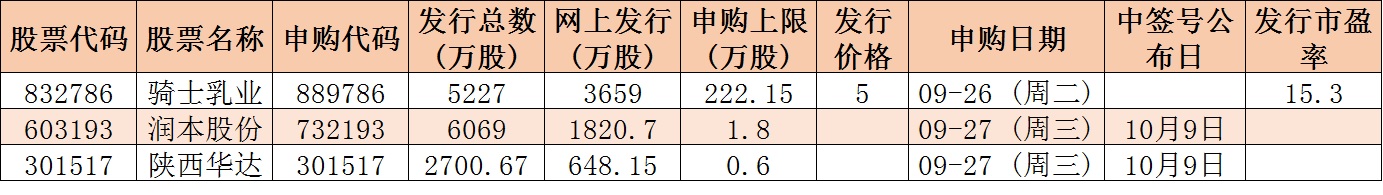 下周是長假前的最后一個交易周,A股僅有4個交易日。根據(jù)發(fā)行安排,下周(9月25日-28日)有3只新股發(fā)行,其中創(chuàng)業(yè)板1只,滬市主板1只,北交所1只。具體安排如下,周二1只,騎士乳業(yè)(北交所);周三2只:潤本股份(主板)、陜西華達(dá)(創(chuàng)業(yè)板)。