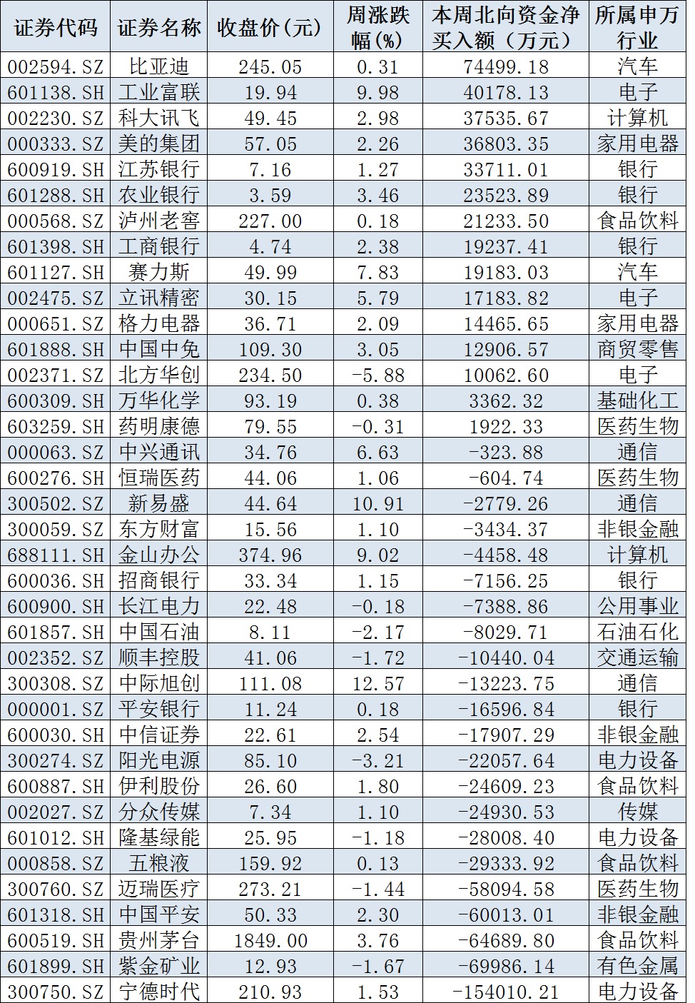 表:本周滬、深股通前十大成交活躍股交易情況: