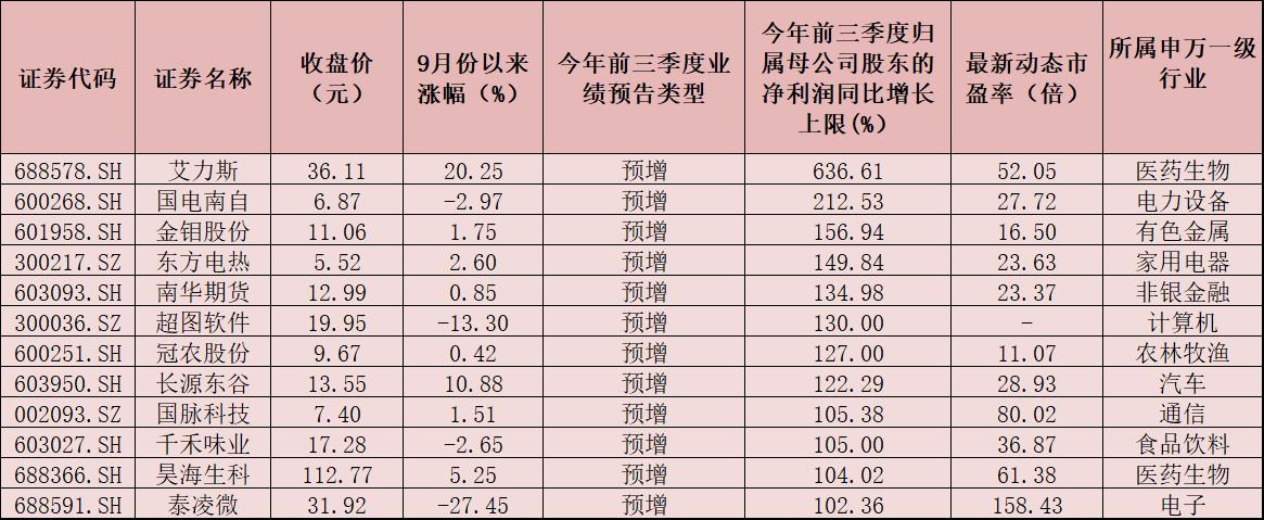 表:12家今年前三季度歸母凈利潤同比增幅上限預(yù)計(jì)超100%公司一覽
