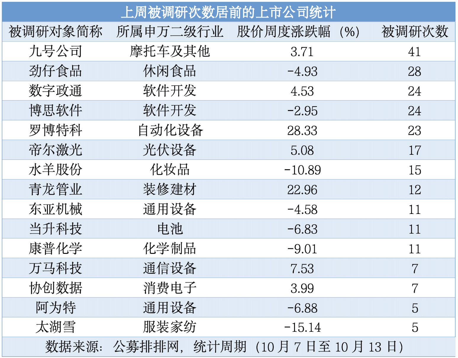 其中,九號(hào)公司被公募機(jī)構(gòu)調(diào)研41次居首,該公司產(chǎn)品涵蓋智能電動(dòng)平衡車(chē)、電動(dòng)滑板車(chē)、電動(dòng)兩輪車(chē)以及智能割草機(jī)器人等短交通和機(jī)器人產(chǎn)品。該公司在2024年上半年的營(yíng)收同比增長(zhǎng)了52.20%,凈利潤(rùn)同比增長(zhǎng)了167.82%。另外,勁仔食品、博思軟件、數(shù)字政通、羅博特科等4家公司上周被調(diào)研次數(shù)居前,均被調(diào)研不少于20次。