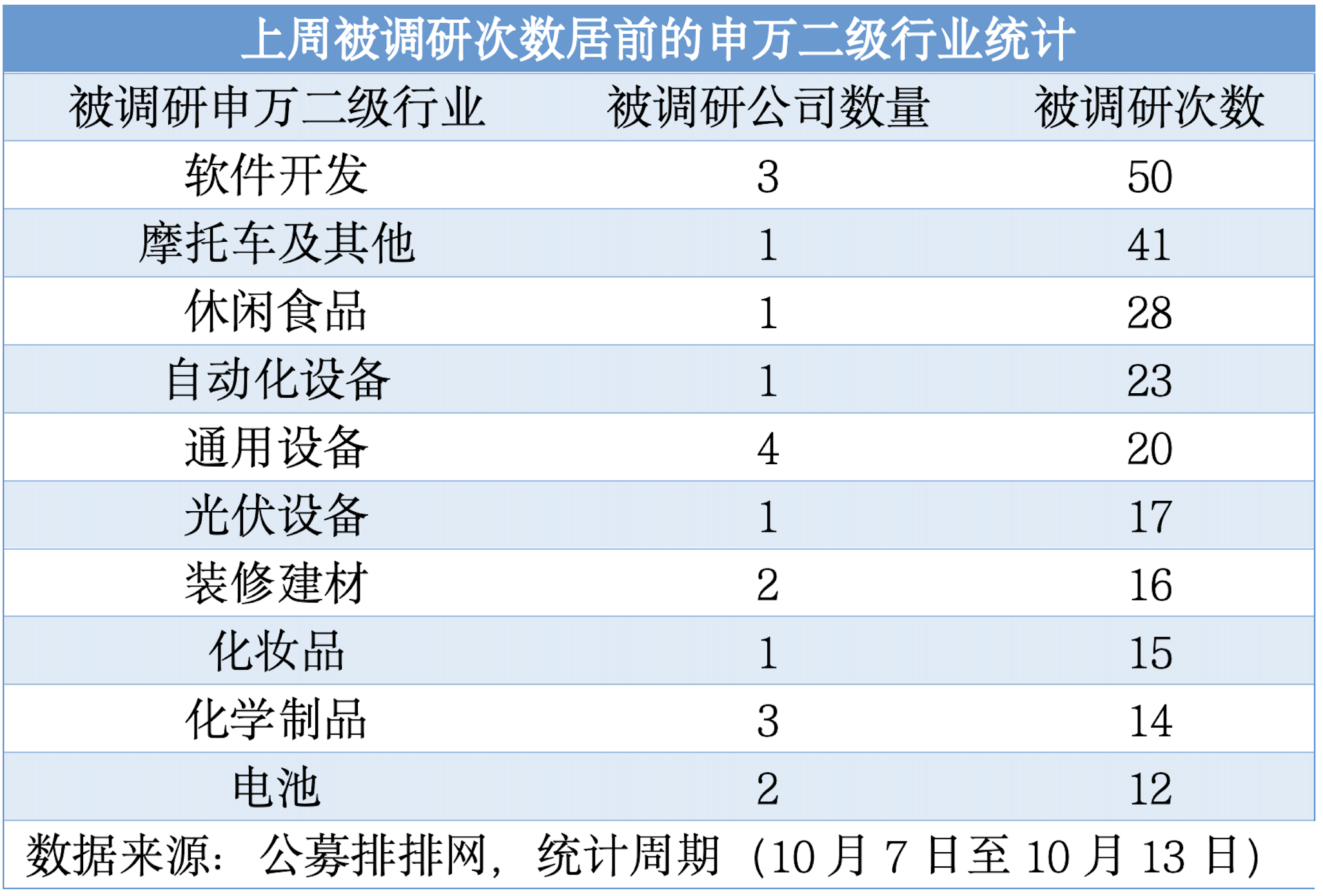 綜合來(lái)看,軟件開(kāi)發(fā)行業(yè)上周有3家上市公司被公募機(jī)構(gòu)調(diào)研50次,無(wú)論是被調(diào)研次數(shù)還是被調(diào)研上市公司數(shù)量均靠前,成為上周最受公募機(jī)構(gòu)青睞的行業(yè)。