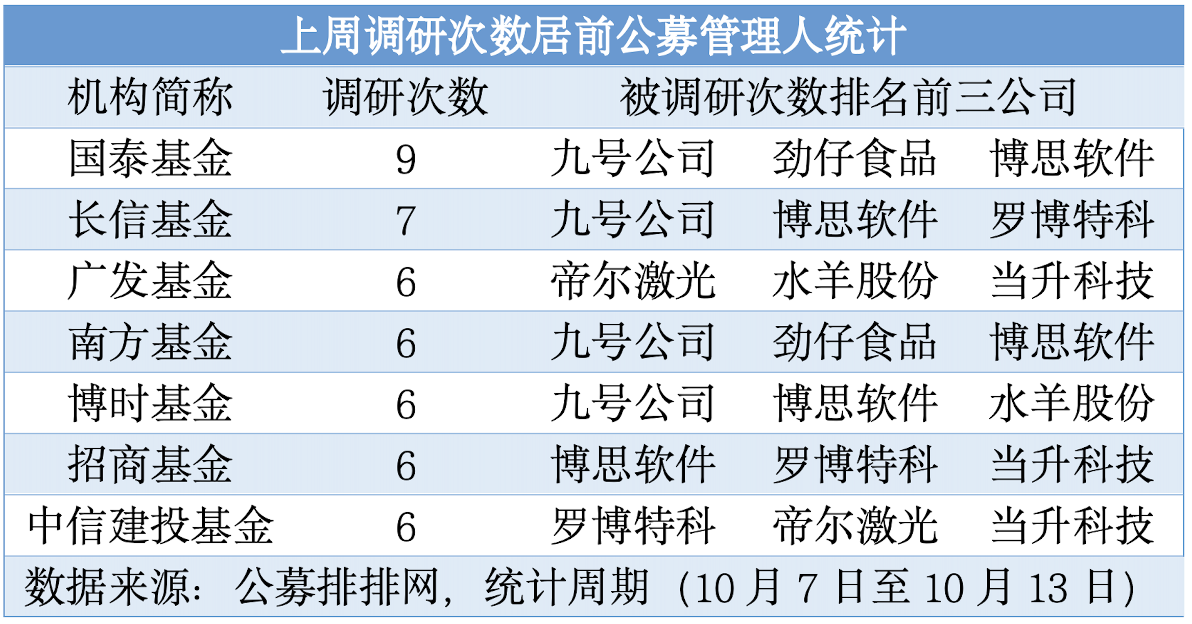上周參與上市公司調(diào)研的107家公募機(jī)構(gòu)中,67家公募機(jī)構(gòu)調(diào)研次數(shù)不少于2次,其中51家調(diào)研2次至4次;16家調(diào)研不少于6次。其中,國(guó)泰基金上周調(diào)研9次居首。此外,長(zhǎng)信基金、廣發(fā)基金、南方基金、博時(shí)基金、招商基金、中信建投基金等公募調(diào)研次數(shù)靠前,均調(diào)研不少于6次。