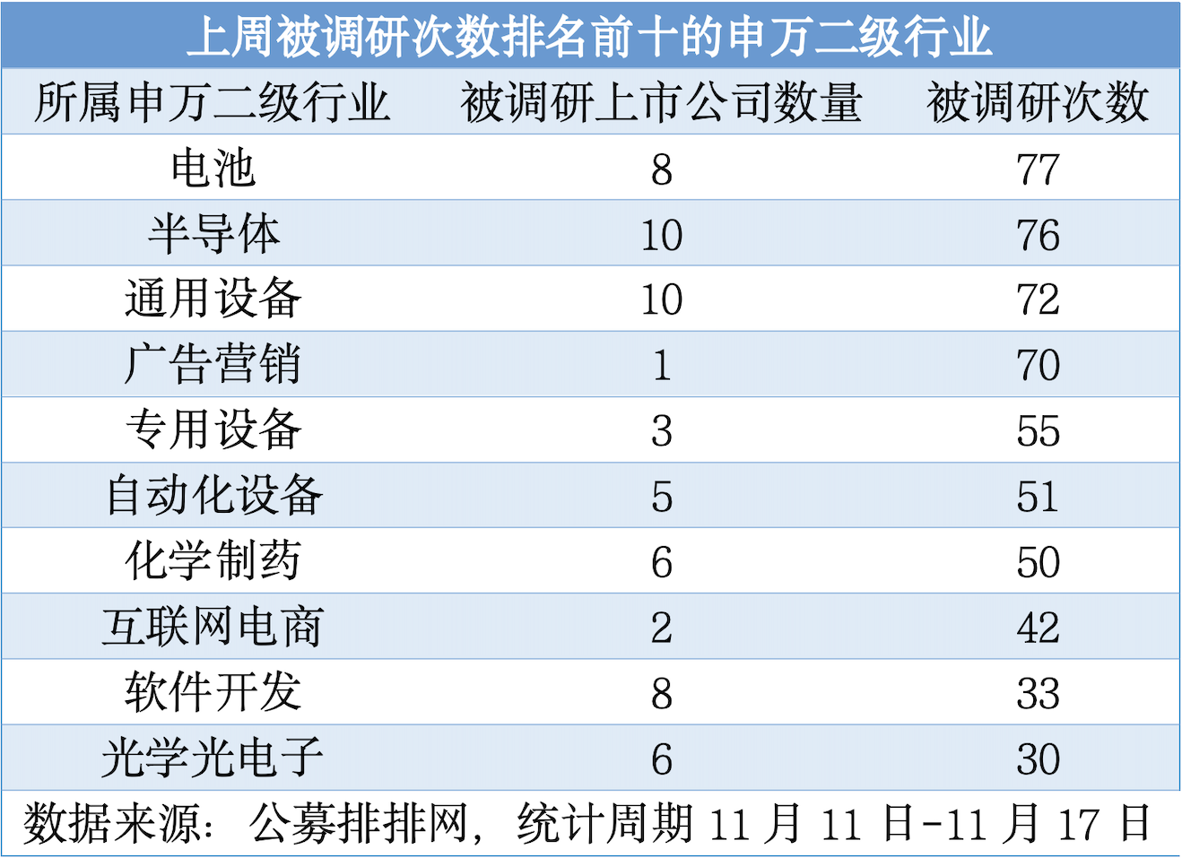電池行業(yè)共有8家上市公司被公募機構(gòu)調(diào)研,合計77次居首。業(yè)內(nèi)人士認為,電池行業(yè)備受關注,估計與近期國內(nèi)首條全固態(tài)鋰電池量產(chǎn)線正式投產(chǎn)消息有關。此外,半導體、通用設備、廣告營銷、專用設備、自動化設備、化學制藥、互聯(lián)網(wǎng)電商、軟件開發(fā)、光學光電子等行業(yè)被調(diào)研次數(shù)均不少于30次。