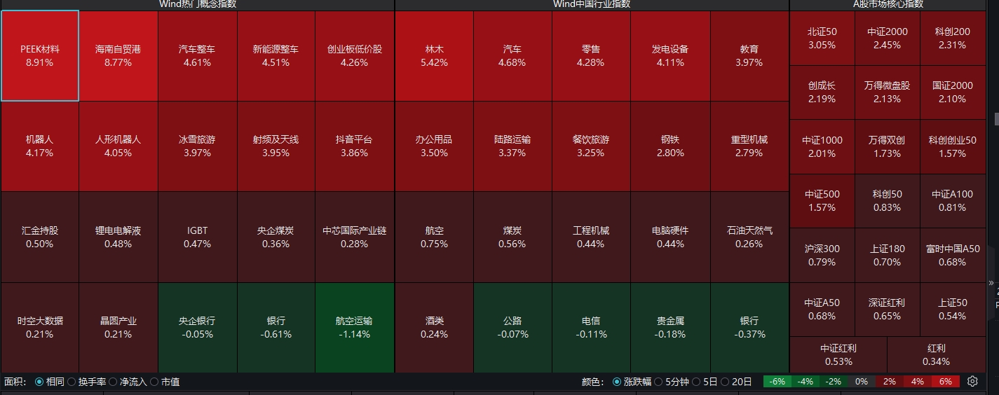 從板塊來看,PEEK材料、海南自貿(mào)區(qū)、汽車整車、新能源整車、創(chuàng)業(yè)板低價(jià)股等板塊漲幅居前。其中,PEEK材料、海南自貿(mào)區(qū)、汽車整車、新能源整車全線飄紅,樣本股均上揚(yáng)。以PEEK材料為例,富恒新材、新瀚新材、肇民科技、華密新材和中欣氟材漲幅均在10%以上。