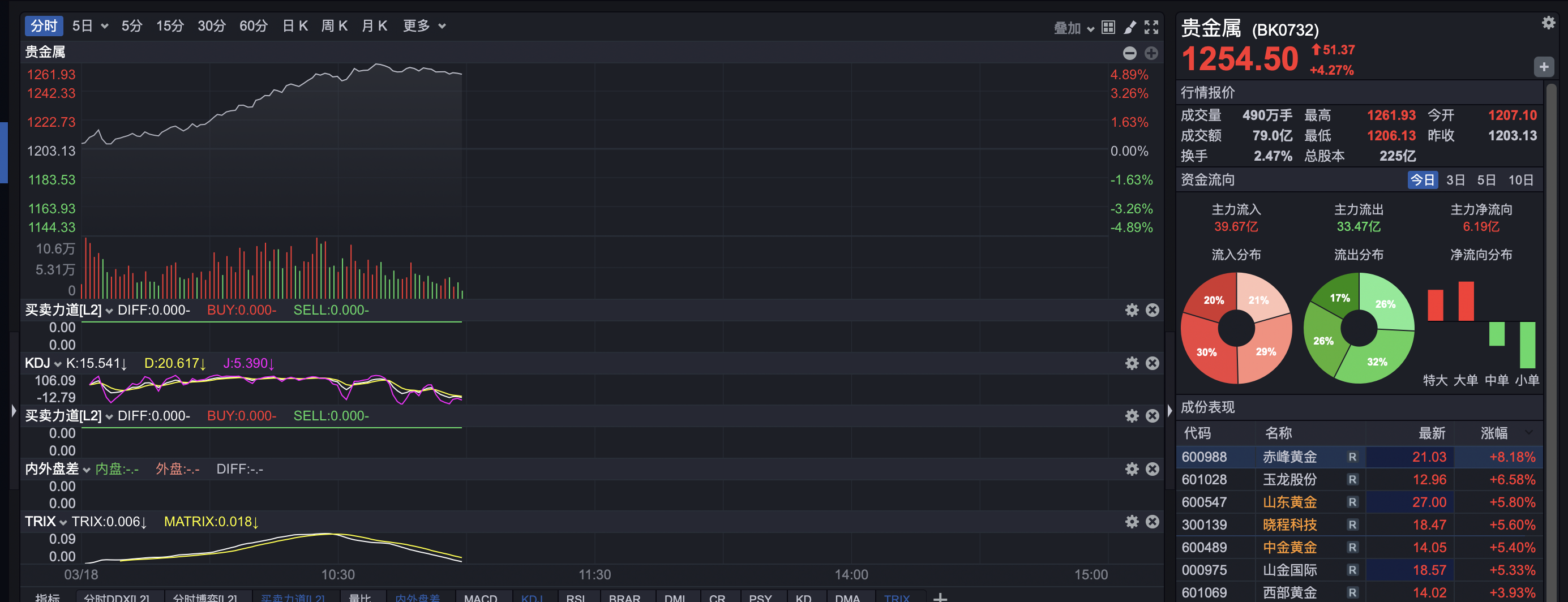 受金價(jià)上漲提振,A股市場(chǎng)貴金屬板塊盤中異動(dòng)拉升,直線上揚(yáng)。截至記者發(fā)稿時(shí),貴金屬行業(yè)板塊指數(shù)大漲4.27%,成份股中,除中潤(rùn)資源投資股份有限公司(證券名稱:*ST中潤(rùn))外,其他個(gè)股悉數(shù)飄紅,赤峰吉隆黃金礦業(yè)股份有限公司(證券名稱:赤峰黃金)以8.18%的漲幅居前。