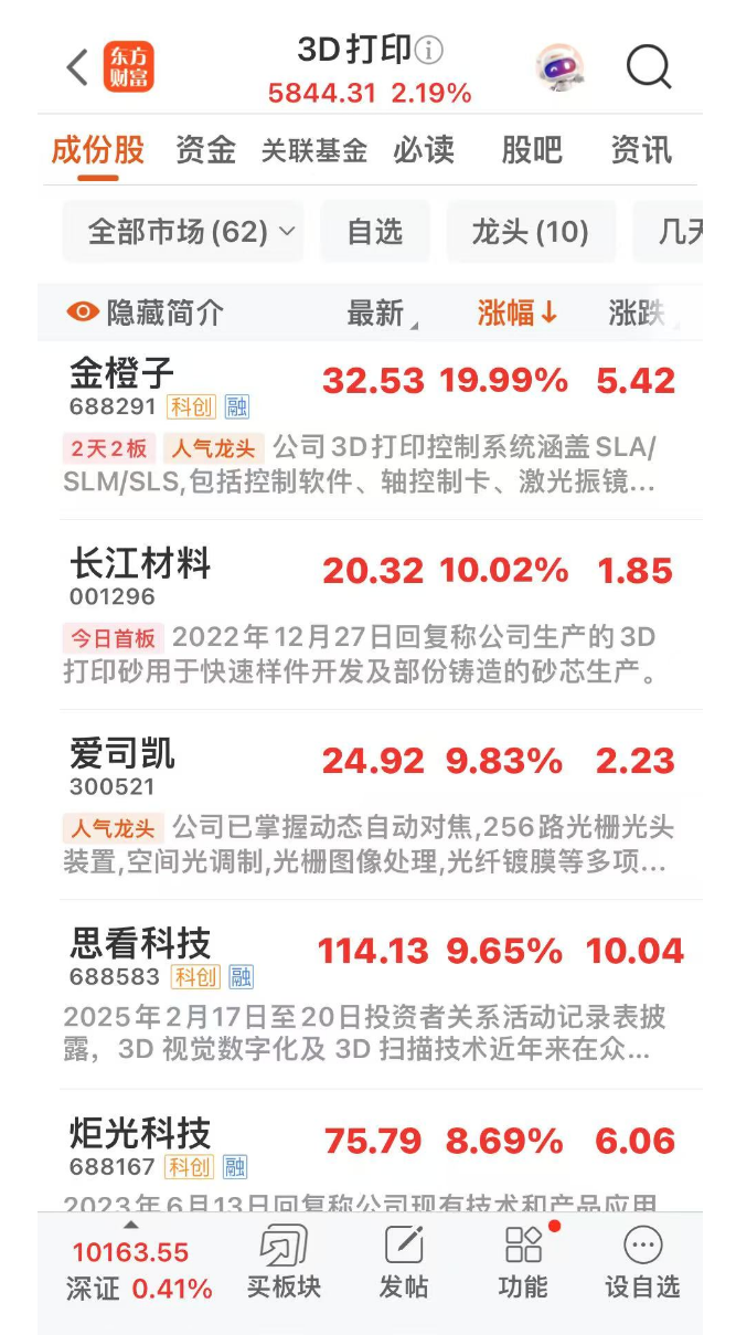 6月16日下午開盤后,3D打印概念板塊漲幅明顯擴(kuò)大。東方財(cái)富軟件顯示,截至收盤,3D打印概念股中金橙子(688291)“20cm”漲停,長(zhǎng)江材料(001296)“10cm”漲停,愛司凱(300521)、思看科技(688583)、炬光科技(688167)、金運(yùn)激光(300220)等股漲超8%。