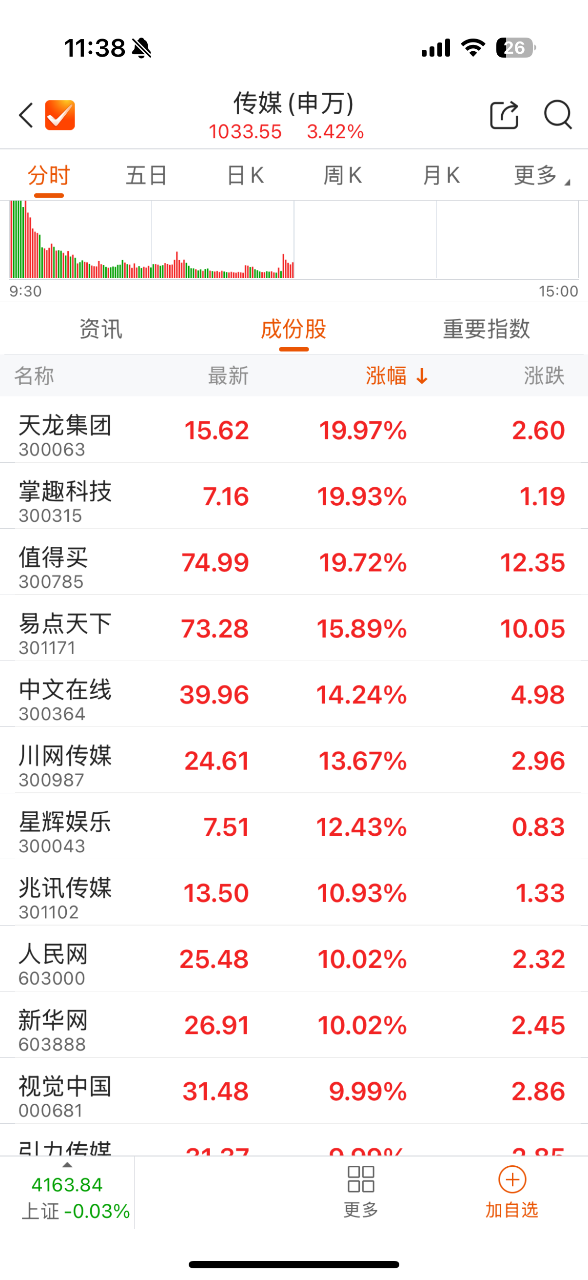 1月13日,傳媒(申萬(wàn))板塊延續(xù)強(qiáng)勢(shì)走勢(shì),截至中午收盤(pán),板塊指數(shù)報(bào)1033.55點(diǎn),單日漲幅達(dá)3.42%,個(gè)股普漲態(tài)勢(shì)顯著。天龍集團(tuán)(300063)、人民網(wǎng)(603000)、新華網(wǎng)(603888)、引力傳媒(603598)等均漲停。其中,引力傳媒7個(gè)交易日內(nèi)錄得6個(gè)漲停。