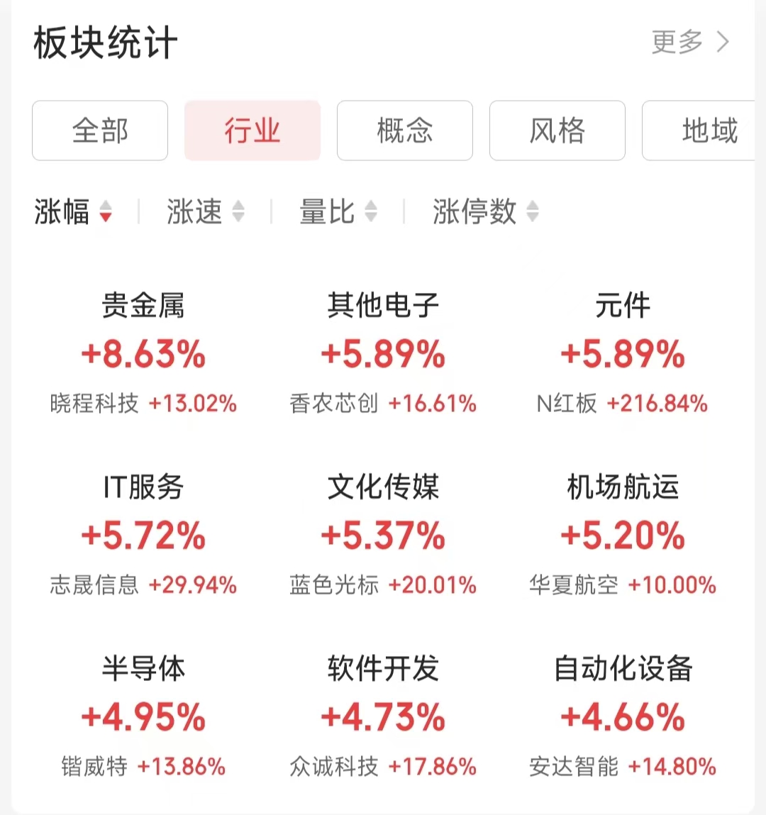 行業(yè)熱點方面,iFinD數(shù)據(jù)顯示,截至4月8日上午收盤,在同花順A股二級行業(yè)中,貴金屬行業(yè)漲幅達到8.63%,位居榜首。其他電子(漲幅5.89%)、元件(漲幅5.89%)、IT服務(漲幅5.72%)等科技及算力相關行業(yè)緊隨其后。此外,文化傳媒、機場航運、半導體等行業(yè)也錄得較大漲幅。