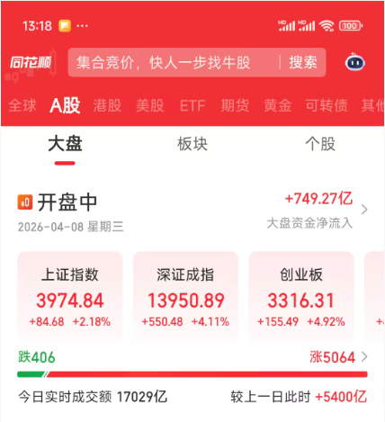 周三(4月8日),A股市場迎來放量大漲,呈現(xiàn)普漲格局。截至記者發(fā)稿,上證指數(shù)上漲2.18%,報3974.84點;深證成指上漲4.11%,報13950.89點;創(chuàng)業(yè)板指上漲4.92%,報3316.31點。滬深兩市合計成交額17029億元,市場交投保持活躍??傮w來看,兩市個股漲多跌少,5064只個股實現(xiàn)上漲。