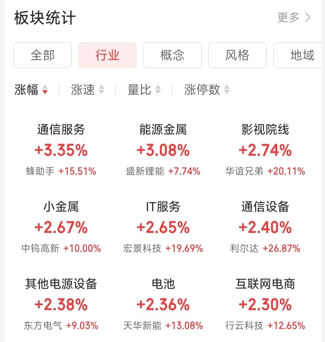 行業(yè)熱點(diǎn)方面,iFinD數(shù)據(jù)顯示,截至4月16日上午收盤,在同花順A股二級(jí)行業(yè)中,通信服務(wù)行業(yè)漲幅達(dá)到3.35%,位居榜首。能源金屬(漲幅3.08%)、影視院線(漲幅2.74%)、小金屬(漲幅2.67%)等行業(yè)緊隨其后。此外,IT服務(wù)、通信設(shè)備、電池等行業(yè)也表現(xiàn)活躍,漲幅均超過(guò)2%。
