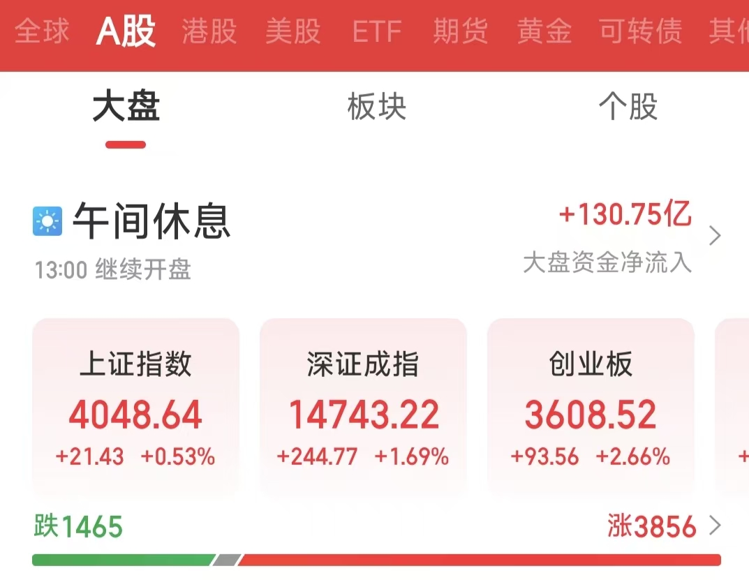 周四(4月16日)早盤,A股三大指數(shù)呈現(xiàn)震蕩上行態(tài)勢(shì),市場(chǎng)情緒整體偏積極。截至上午收盤,上證指數(shù)上漲0.53%,報(bào)4048.64點(diǎn);深證成指上漲1.69%,報(bào)14743.22點(diǎn);創(chuàng)業(yè)板指上漲2.66%,報(bào)3608.52點(diǎn)。滬深兩市合計(jì)成交額14618.73億元,市場(chǎng)交投活躍??傮w來(lái)看,個(gè)股漲多跌少,共有3856只個(gè)股實(shí)現(xiàn)上漲。