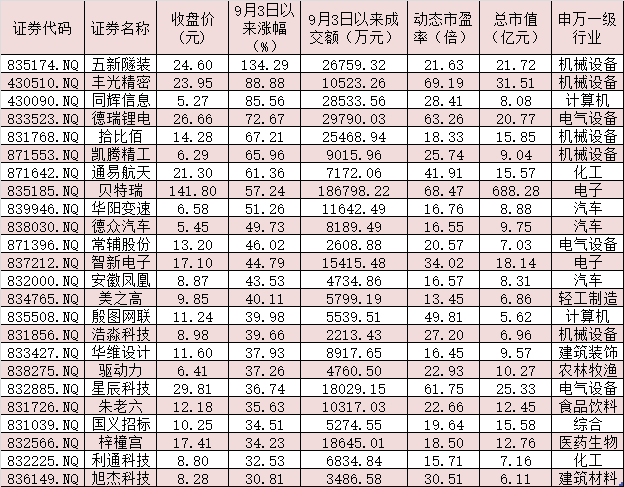 表:9月3日以來漲幅超30%的新三板精選層個股一覽