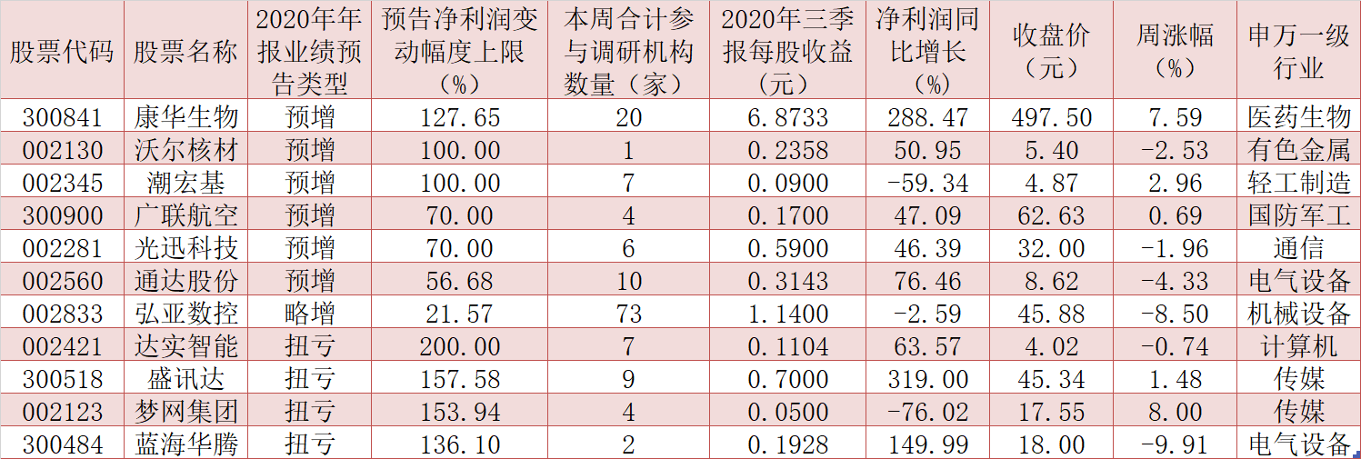 出色的年報(bào)業(yè)績預(yù)期向好或是近期機(jī)構(gòu)頻繁調(diào)研的重要動力。在上述本周被機(jī)構(gòu)調(diào)研的109家公司中,截至目前,已有12家公司率先披露了2020年年報(bào)業(yè)績預(yù)告,業(yè)績預(yù)喜公司共有11家??等A生物、沃爾核材、潮宏基等3家公司均預(yù)計(jì)2020年全年凈利潤同比翻番;廣聯(lián)航空、光迅科技、通達(dá)股份、弘亞數(shù)控等4家公司2020年全年凈利潤也均有望同比增長20%以上;達(dá)實(shí)智能、盛訊達(dá)、夢網(wǎng)集團(tuán)、藍(lán)海華騰等4家公司2020年全年業(yè)績也均有望扭虧為盈。