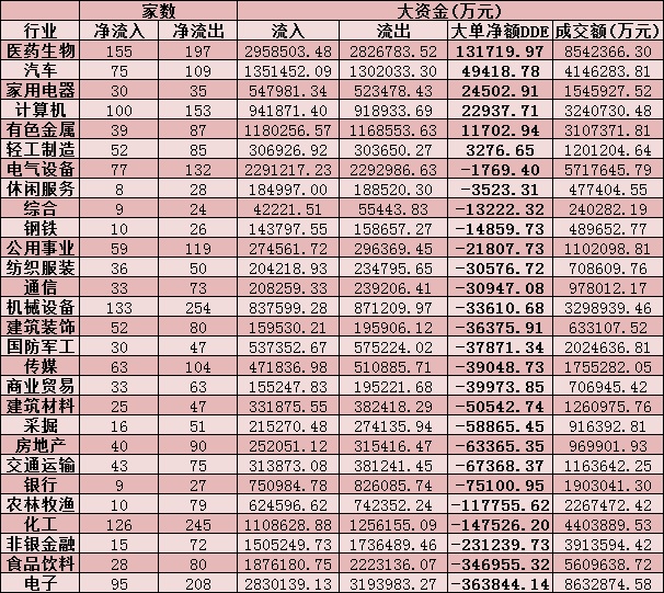 從資金層面看,今日A股大單資金整體凈流出158.3億元,其中,有1395只個(gè)股凈流入,2623只個(gè)股凈流出。從申萬一級的28個(gè)行業(yè)來看,有6個(gè)行業(yè)呈現(xiàn)大單資金凈流入態(tài)勢,其中,醫(yī)藥生物行業(yè),資金凈流入為13.17億元,位居首位。緊隨其后的是汽車、家用電器、計(jì)算機(jī)、有色金屬等四行業(yè)資金凈流入均超1億元。另外,電子、食品飲料、非銀金融、化工等四行業(yè)資金凈流出居前,均超10億元。