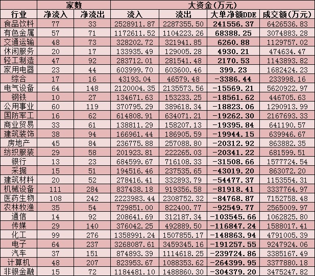 從資金層面看,今日A股大單資金整體凈流出158.9億元,其中,有1178只個(gè)股凈流入,2870只個(gè)股凈流出。從申萬(wàn)一級(jí)的28個(gè)行業(yè)來(lái)看,有6個(gè)行業(yè)呈現(xiàn)大單資金凈流入態(tài)勢(shì),其中,食品飲料和有色金屬兩行業(yè),資金凈流入均超6億元,分別為24.16億元和6.84億元,合計(jì)31億元,位居前列。緊隨其后的是交通運(yùn)輸、休閑服務(wù)、輕工制造、家用電器四行業(yè),資金均呈現(xiàn)凈流入態(tài)勢(shì)。另外,非銀金融、計(jì)算機(jī)、汽車三行業(yè)資金凈流出居前,均超20億元。