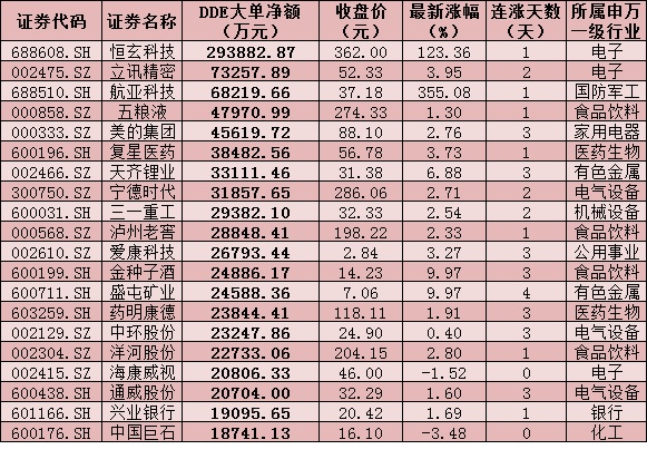 一、周三(12月16日)DDE大單資金凈買入TOP20