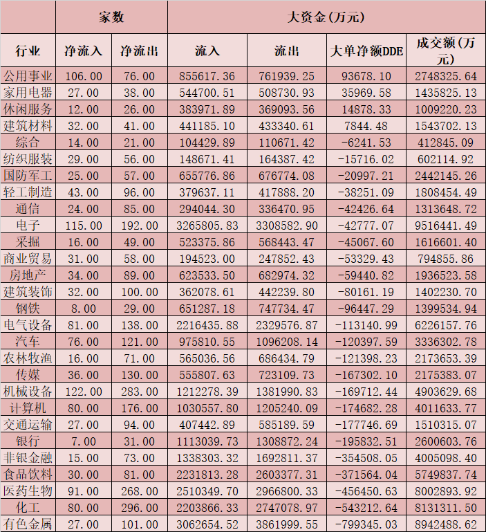 從資金層面看,周二,A股大單資金整體凈流出411.23億元,其中,有1226只個(gè)股呈現(xiàn)資金凈流入,2854只個(gè)股呈現(xiàn)資金凈流出。從申萬(wàn)一級(jí)的28個(gè)行業(yè)來(lái)看,有4個(gè)行業(yè)均現(xiàn)資金凈流入態(tài)勢(shì),其中,公用事業(yè)以9.37億元大單資金凈流入居首位,緊隨其后的家用電器行業(yè),大單資金凈流入3.60億元,休閑服務(wù)和建筑材料等行業(yè)也均實(shí)現(xiàn)資金凈流入。