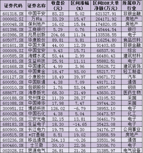 從具體的個(gè)股情況來(lái)看,節(jié)后以來(lái)的9個(gè)交易日中,有1206只個(gè)股呈現(xiàn)資金凈流入態(tài)勢(shì),占可交易個(gè)股總數(shù)的28.8%。其中,有88只個(gè)股期間大單資金凈流入超1億元,中國(guó)平安、萬(wàn)科A、保利地產(chǎn)、工商銀行、兆易創(chuàng)新、華康股份等6只個(gè)股,期間累計(jì)資金凈流入均超10億元,分別為62.13億元、26.42億元、17.48億元、14.54億元、13.35億元、11.63億元,合計(jì)資金凈流入達(dá)145.55億元