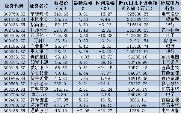 從滬股通、深股通前十大成交活躍股來看,節(jié)后以來的10個交易日中,共有37只個股現(xiàn)身前十大成交活躍股榜單,19只活躍股處于期間凈買入狀態(tài),北上資金合計(jì)凈買入182.79億元。其中,寧德時代(32.5億元)、中國平安(22.48億元)、招商銀行(21.48億元)、牧原股份(15.28億元)、萬華化學(xué)(12.38億元)、萬科A(12.19億元)、興業(yè)銀行(11.13億元)、平安銀行(10.02億元)等個股期間北上資金合計(jì)凈買入額居前,均在10億元以上,多數(shù)為藍(lán)籌股。