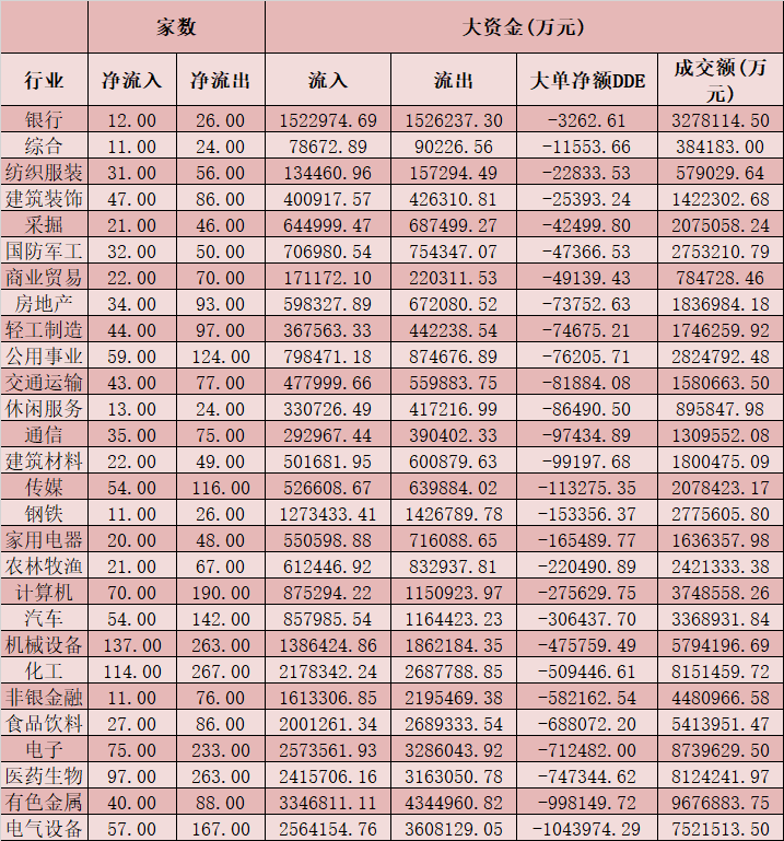 從資金層面看,周四,A股大單資金整體凈流出778.23億元,其中,有1208只個股呈現(xiàn)資金凈流入,2906只個股呈現(xiàn)資金凈流出。從申萬一級的28個行業(yè)來看,全部呈現(xiàn)資金凈流出態(tài)勢,其中,電氣設備、有色金屬、醫(yī)藥生物等三大行業(yè),資金凈流出居前。