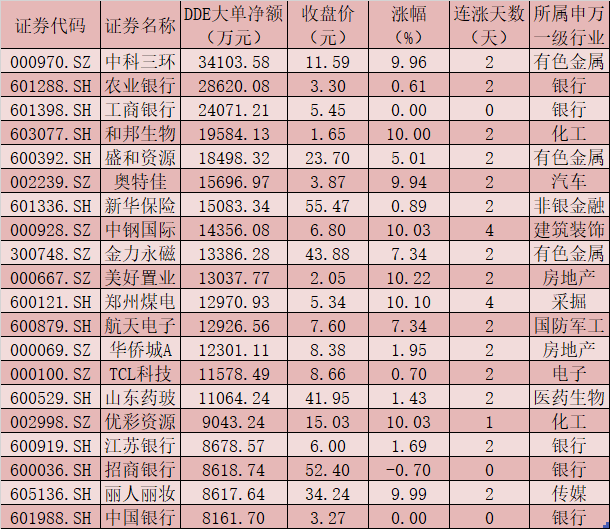 一、周四(3月4日)DDE大單資金凈買入TOP20
