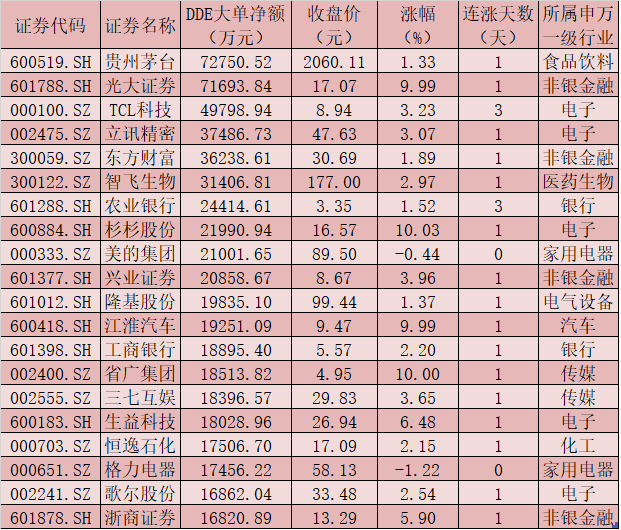 從資金層面看,周五,A股大單資金整體凈流出162.39億元,其中,有1751只個(gè)股呈現(xiàn)資金凈流入,2365只個(gè)股呈現(xiàn)資金凈流出。從申萬一級(jí)的28個(gè)行業(yè)來看,有6個(gè)行業(yè)呈現(xiàn)資金凈流入態(tài)勢(shì),其中,非銀金融和食品飲料等兩大行業(yè),資金凈流入居前均在10億元以上。光大證券表現(xiàn)強(qiáng)勁,股價(jià)漲停。