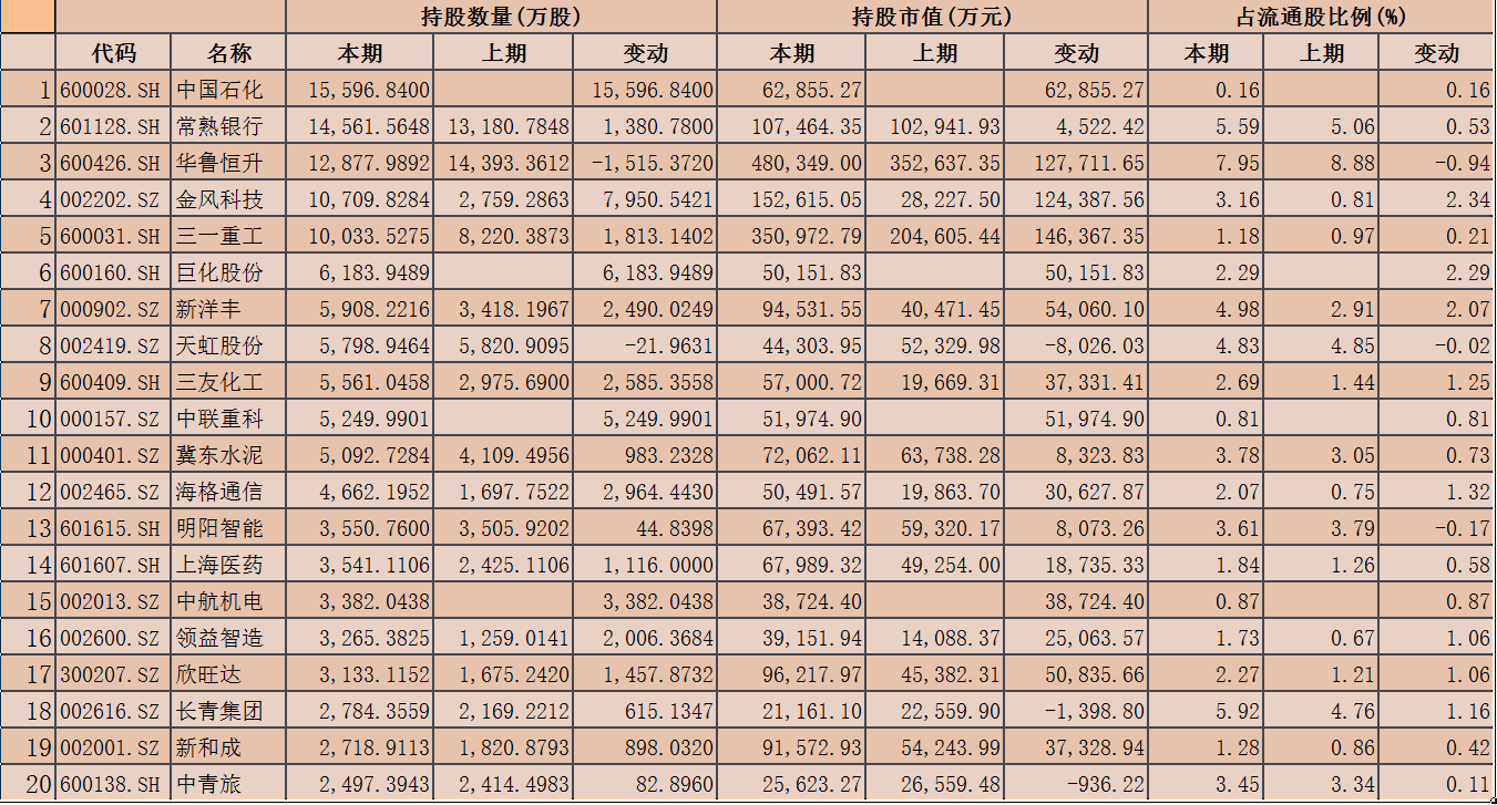 從持股數(shù)量來看,截至2020年四季度末,上述87家公司中,中國石化、常熟銀行、華魯恒升、金風科技和三一重工等5家公司社?;鸪止蓴?shù)量居前,均在1億股以上。