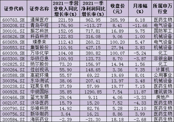 具體來看,中鋼國際一季度凈利潤同比增幅居首,為1290.85%。緊隨其后的通策醫(yī)療、振芯科技、集智股份、萬華化學(xué)、科森科技、璞泰來、東華測試、納爾股份、佳創(chuàng)視訊、華鐵應(yīng)急等10家公司,今年一季度凈利潤同比增長也均超過100%。