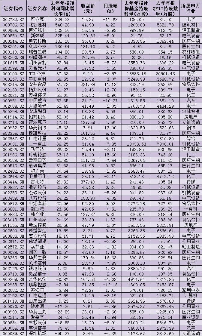 統(tǒng)計發(fā)現(xiàn),上述59只個股中,有48家公司2020年年報實現(xiàn)凈利潤同比增長,占比達(dá)81.36%。其中,可立克、北新建材、博匯紙業(yè)、新強聯(lián)、迪安診斷、奕瑞科技、瑞普生物等7家公司凈利潤同比增長均超100%。