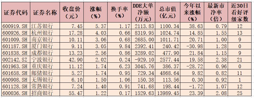 具體來看,最近30日內(nèi),有34只個股獲機構(gòu)給予“買入”或“增持”等看好評級,其中,平安銀行、招商銀行、寧波銀行看好評級家數(shù)居前,分別獲得看好評級家數(shù)為31家、25家、21家,此外,興業(yè)銀行、杭州銀行、江蘇銀行、常熟銀行、北京銀行、郵儲銀行、長沙銀行、建設銀行等8只個股均獲得10家及以上機構(gòu)看好評級。
