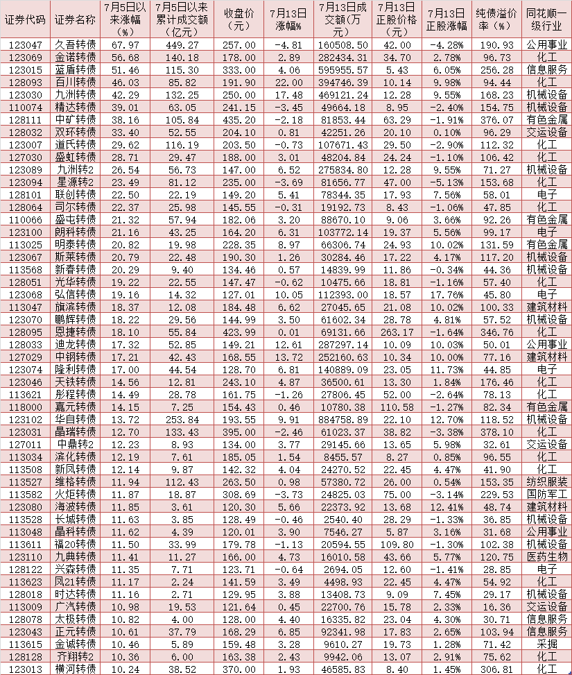 表:7月5日以來累計漲幅超10%的可轉(zhuǎn)債一覽