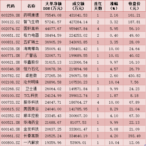 一、周三(7月14日)DDE大單資金凈買(mǎi)入TOP20